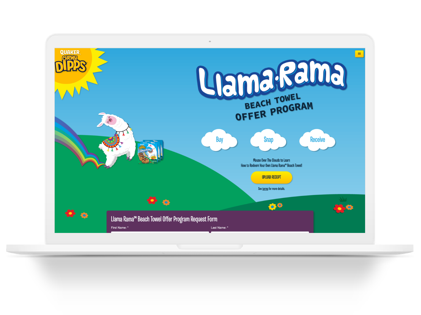 MRi to work developing a promotion to meet the challenges the Quaker Chewy Dipps Llama Rama campaign faced, and an offer program was the perfect answer. With an offer program, our experts knew Chewy Dipps could increase sales for their Llama Rama granola bars by using our OCR receipt Scanning Technology in combination with an exciting reward. And since the Llama Rama creative was so unique and fit their audience, a Llama Rama beach towel was the perfect summer-themed reward.
